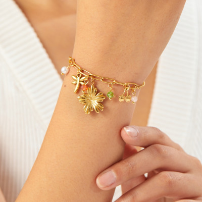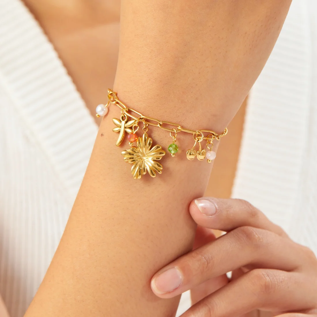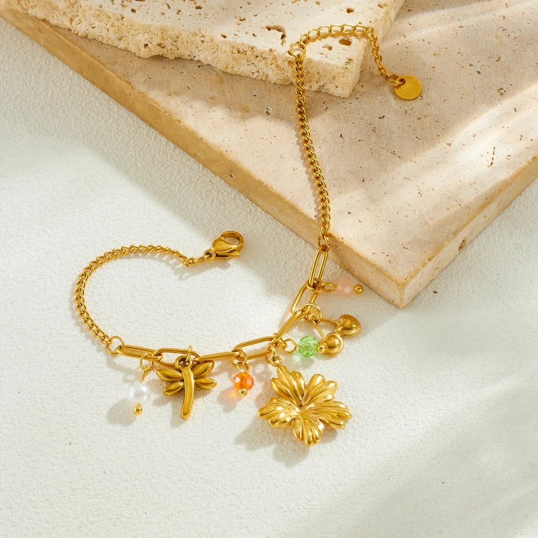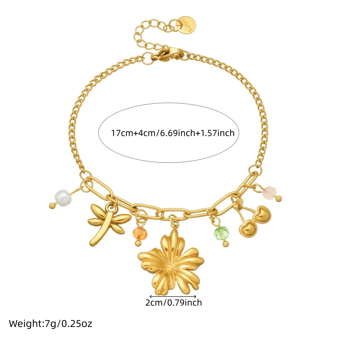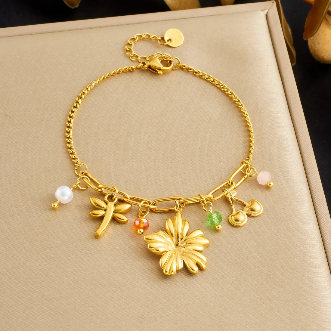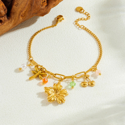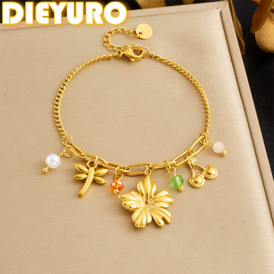 DIEYURO 316L الفولاذ المقاوم للصدأ الذهبي زهرة اليعسوب الكرز الملونة كريستال اللؤلؤ سوار المرأة موضة سلسلة اليد مجوهرات